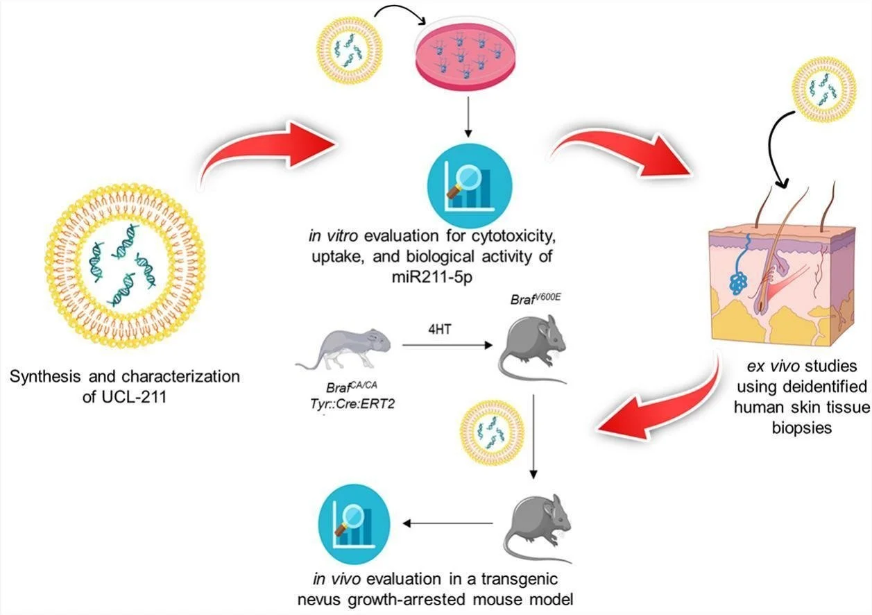 Transdermal delivery of ultradeformable cationic liposomes complexed with miR211-5p (UCL-211) stabilizes BRAF600E+ melanocytic nevi. Chhibber et al., Journal of Controlled Release. 2025; 381:113586